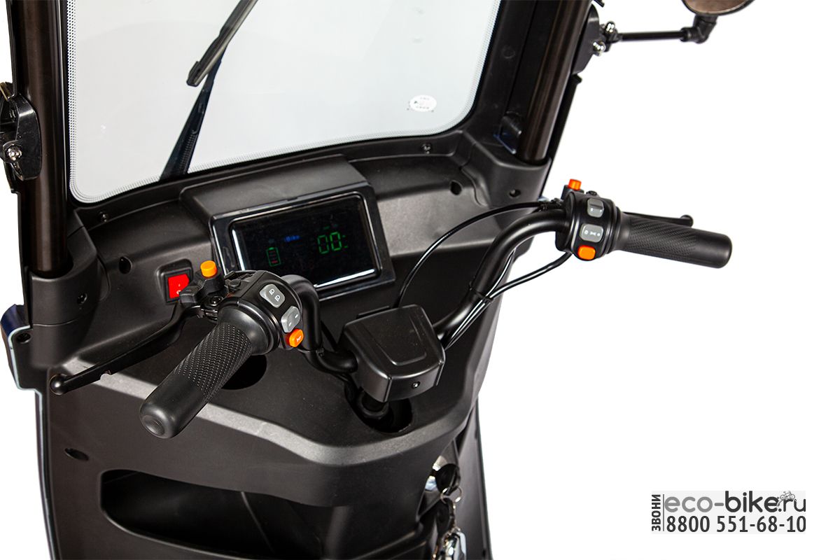 Этот современный компактный и юркий трёхколёсный электроскутер прекрасно подойдёт как для частного, так и для коммерческого использования. Наличие крыши с большим обзорным лобовым стеклом и стеклоочиститель расширяют сферу применения новинки.
